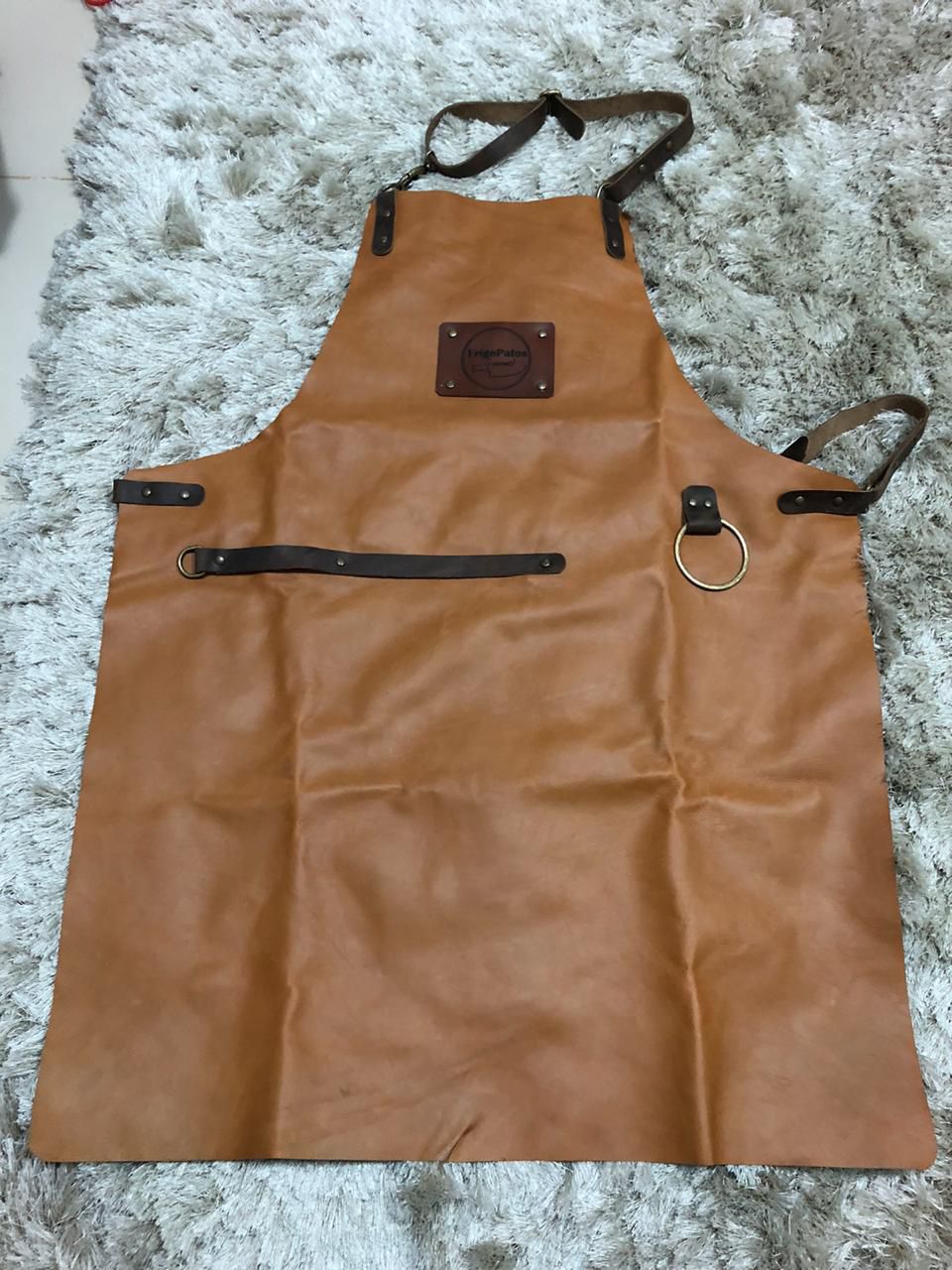 Modelo mais leve e mais curto, é próprio para trabalhos em churrasqueiras e parrillas, com argola para suporte de panos. Tamanho: 80x60 cm Tira: 1 pescoço e 1 na cintura